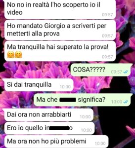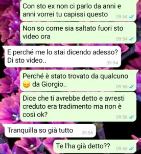 Giorgio mi ha dato qualche tempo per pensare alla sua “proposta” e allora ho deciso di contattare Simone, non riuscivo a parlarci faccia a faccia, e dirgli tutto. Sia del video fatto prima di stare con lui, sia di quello che mi ha detto il suo amico. Mi aspettavo il suo aiuto, ma la verità è stata molto, ma molto più amara di così.”