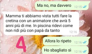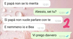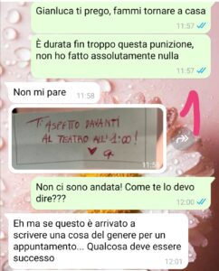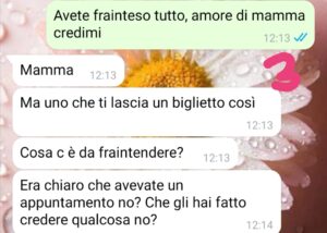 Poi una sera al ritorno dalla cena, mio figlio Alessio trova un biglietto sotto la porta della nostra stanza…e da lì vi lascio leggere là chat.