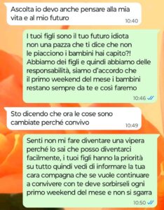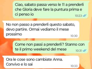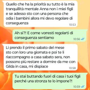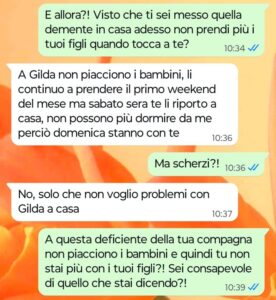“Ciao Spunte Blu, sono una mamma single perché già diversi anni fa io e il mio compagno abbiamo deciso di separarci pur avendo due bambini. Adesso il problema è appunto la gestione dei figli, gestione che fino ad ora, devo ammettere, non ha comunque rappresentato un grosso problema ma adesso il mio compagno ha iniziato a convivere con una vipera e dalla discussione che abbiamo avuto io e lui stamattina ho già capito che ne vedremo delle belle. In ogni caso io resto ferma sul mio punto e non ho intenzione di cedere o mollare per niente al mondo. Leggete pure cosa è successo oggi dalla chat che ho inviato…”