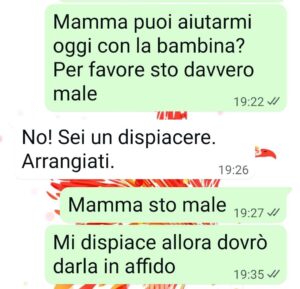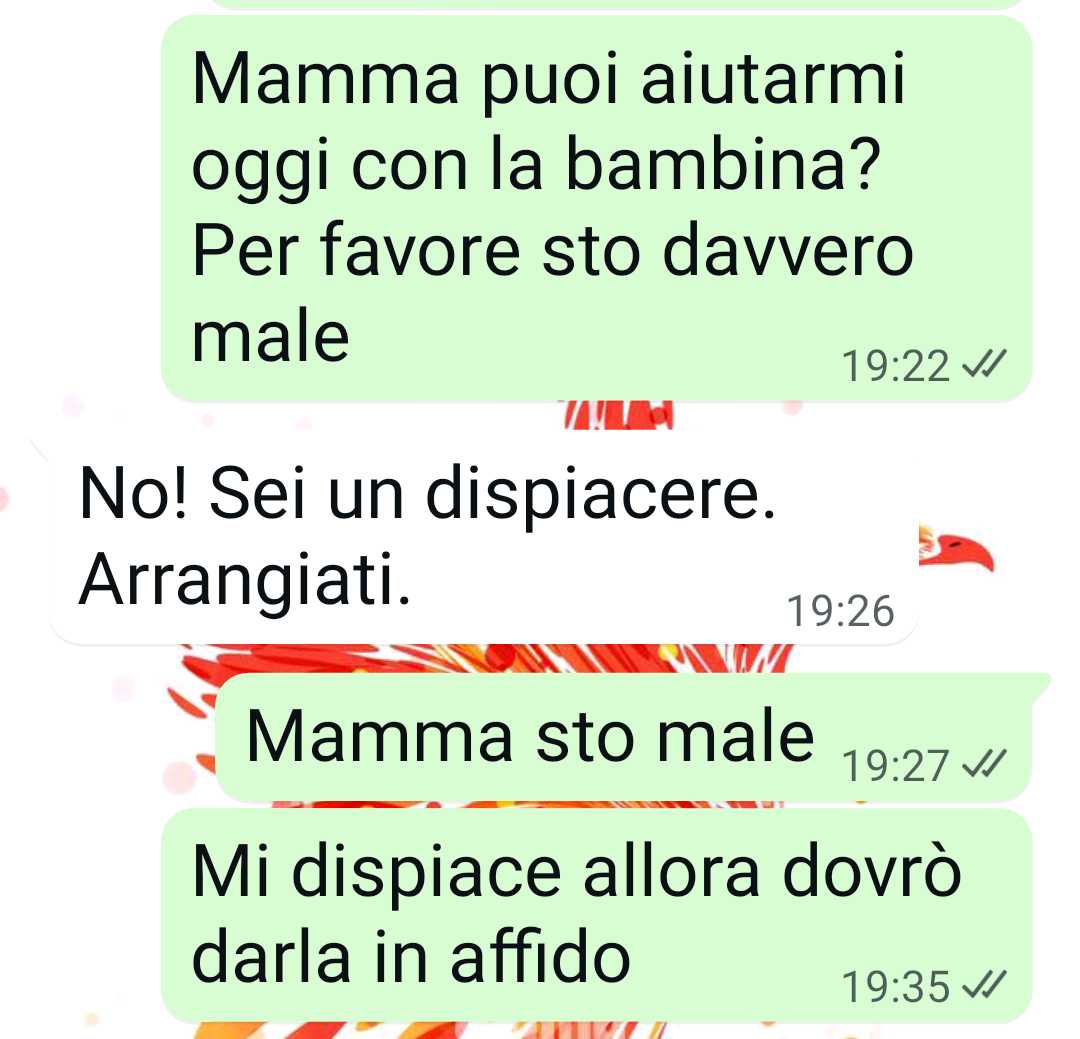 Scusate se vi interpello su un tema così personale. Ma sono davvero sola. Non ho nessuno al momento con cui parlare e confrontarmi. Sono una mamma single e anche i miei genitori mi hanno voltato le spalle. Quella che leggete è la chat con mia mamma. Per l’ennesima volta le ho chiesto aiuto e per l’ennesima volta lei mi ha detto no. Non ce la faccio più. Mi sento sempre senza forze e triste, estremamente giù.
