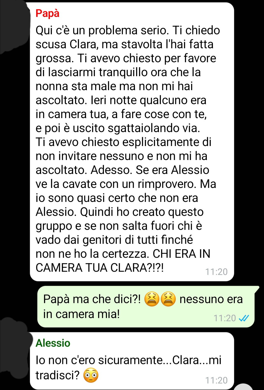 “Ci sono momenti in cui ti senti improvvisamente messa sotto processo, anche se sai di non aver fatto nulla di sbagliato. È una sensazione umiliante, soprattutto quando arriva da chi dovrebbe fidarsi di te più di chiunque altro. Mio padre, ultimamente, non è più lo stesso. Lo vedo stanco, nervoso, sempre sull’orlo di perdere il controllo. La situazione con mia nonna lo sta logorando giorno dopo giorno, e io lo capisco, davvero. So che quando una persona soffre così tanto, finisce per riversare la tensione dove capita. Ma capirlo non significa accettarlo. Mi ritrovo coinvolta in una situazione assurda, sproporzionata, che mi fa sentire esposta e giudicata davanti a persone che non c’entrano nulla. Come se la mia parola non bastasse più. Come se la mia vita privata fosse diventata improvvisamente un affare pubblico, qualcosa da analizzare, discutere, smontare pezzo per pezzo. La cosa che fa più male, però, non è nemmeno l’accusa in sé: è la sensazione che nessuno stia davvero ascoltando quello che dico. Mio padre mi accusa di aver fatto entrare un ragazzo in camera mia una di queste notti, ma non è vero! E ora sono coinvolti tutti!”