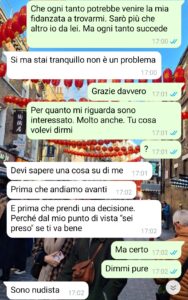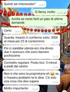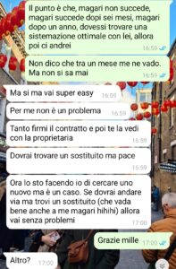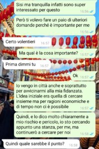 “Vivo nel Nord Italia e anche la mia fidanzata, Laura, è originaria del mio stesso paese. Lei però, per ragioni di studio/lavoro, vive da due anni nel centro sud, non dico dove, una città molto bella e famosa ma non tra le più turistiche. Abbiamo sempre vissuto bene a distanza, perché ci amiamo, e siamo sempre andati avanti così. Ma ormai, non essendo più proprio giovanissimi, abbiamo voglia di stare insieme di più. L’idea, dato che io lavoro principalmente in smart e, quando di persona, posso trovare lavori in varie città italiane, era che io andassi verso di lei, per stare finalmente nella stessa città. All’inizio volevamo cercare insieme ma per budget, tempo e altri impedimenti, per ora abbiamo deciso di no. Saremo nella stessa città, ci vedremo tutti i giorni, sarà bellissimo, ma io troverò una stanza per me. Ovviamente, sempre per ragioni di budget, cerco con altre persone. Avevo trovato questa stanza, bellissima, economica, con una tipa che sembrava in gamba…sembrava tutto fatto, stavo per trasferirmi, se lei mi avesse dato il via libera, ma poi c’è stata questa conversazione.”