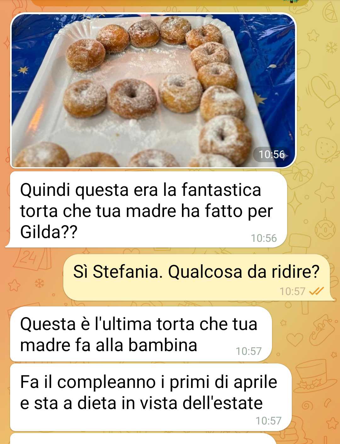 “Mia figlia ha compiuto tre anni. La mia ex moglie si è arrabbiata per la torta a ciambelline fatta da mia madre. Dice che siamo ad aprile e nostra figlia è a in fase di definizione.