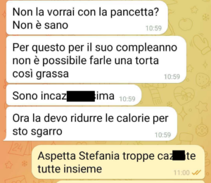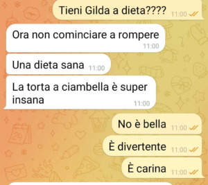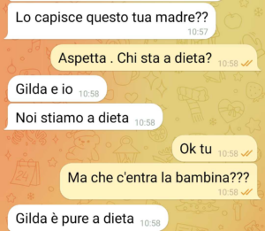 Sono diventato una bestia. La bambina purtroppo sta la maggior parte del tempo con la madre che è una super fissata della palestra e dalla alimentazione. Per farvi capire il suo modello di fisico di una donna è quello delle culturiste, con le braccia e le gambe muscolose come Rambo. Lei è libera di fare quello che vuole. Ma la bambina a tre anni può mangiare tranquilla la torta per il suo compleanno?? E chissenefrega dei grassi polinsaturi e degli zuccheri semplici. È il suo compleanno!!! Io voglio che la mia bambina abbia una bella infanzia, che se la goda, che mangi qualche schifezza ogni tanto, per godersi la vita e vederla col sorrisone. C’è poi una vita per stare a dieta. Invece mia moglie è convintissima di quello che dice. E vi invito a leggere la chat, perché non sono io che sono troppo menefreghista. Non sono io che voglio il male di mia figlia. La mia ex moglie per rimediare sta togliendo alla mia bambina una cosa che reputo essenziale. Non so come farla ragionare.”