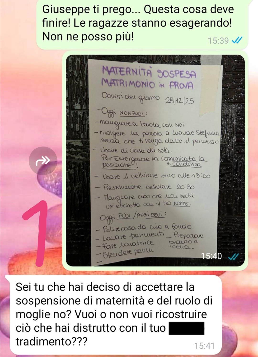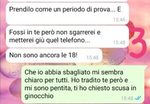 Ho confessato tutto a mio marito, che non ho mai avuto intenzione di lasciare. Lui ha detto che ho messo a rischio la nostra famiglia, abbiamo due figlie adolescenti, e che la decisione di perdonarmi doveva essere presa da tutti e tre, da lui e dalle mie figlie. Perché io ho ferito tutti. E purtroppo si che è vero. Così le mie figlie, dopo avermi fatto sentire una schifezza, mi hanno chiesto se fossi pronta a qualsiasi cosa pur di farmi perdonare e provare a rimettere insieme i pezzi che io e solo io avevo rotto. Ho risposto di sì… ma non lo avessi mai fatto. Da quel momento è iniziato un vero incubo. Io voglio davvero che tutto torni come prima ma devo fermare tutto questo…accetto consigli di qualsiasi tipo! Grazie 🙏 non so più che fare…”