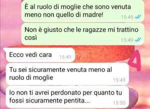 So che potrebbero vederla lo stesso questa chat…ma pazienza. Io sono esausta per quello che sta succedendo nella mia famiglia e ho bisogno di sfogarmi. Faccio subito un mea culpa: purtroppo ho ceduto e ho tradito mio marito con un giovane collega di 26 anni. La relazione è iniziata nell’estate del 2024 e si è conclusa dopo un anno per mia volontà. Ho capito che stavo solo ricercando una giovinezza che non ho più, purtroppo.