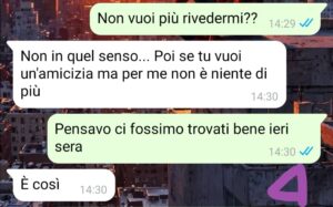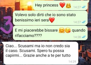 La serata va anche molto bene, chiacchieriamo di tutto…io ero convinto ci sarebbe stato un secondo appuntamento, ma quando il giorno dopo le scrivo, guardate cosa succede…