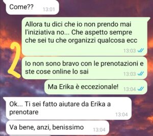 Ma dato che io sono un po’ imbranato a prenotare le cose online e a scegliere il posto più carino ecc…chiedo aiuto alla migliore amica di Nadia, Erika, che invece è una super esperta in queste cose. Infatti in meno di un due giorni mi aiuta a organizzare tutto…e quando stiamo per finalizzare il tutto succede una cosa che io non ritenevo grave.