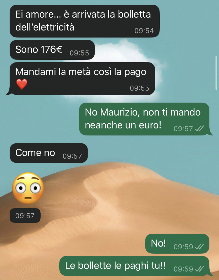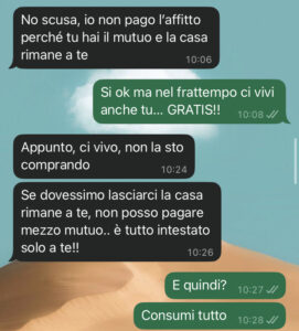 Lui sostiene una certa posizione su come dovremmo dividerci le spese, io un’altra… e diciamo che la sua idea mi sta facendo sentire un po’ presa in giro, per non dire altro. Ho proprio la sensazione che stia cercando di girarla a suo favore, come se fosse normale. Mi sento usata e sfruttata, perché vuole che sia io a pagare la metà delle bollette, ma vista la nostra situazione… non può funzionare così!!