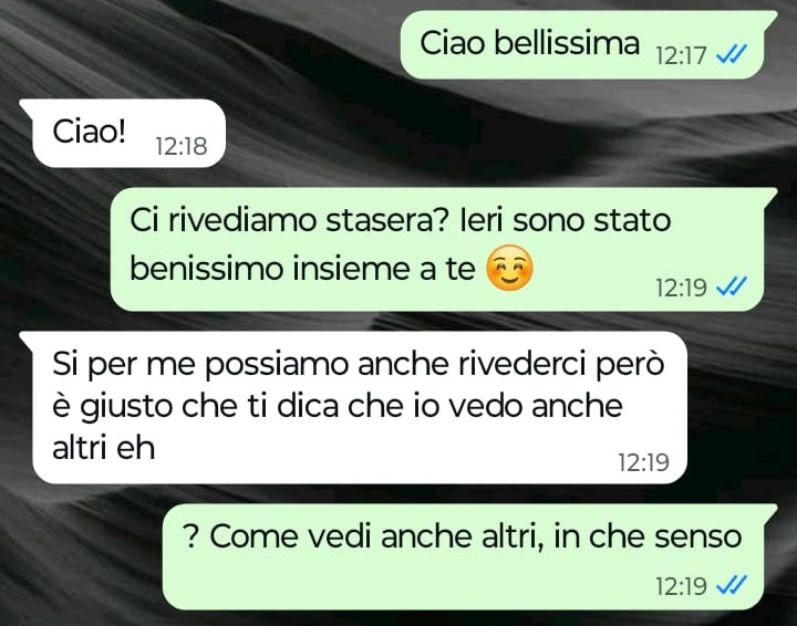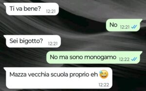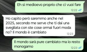 “Ciao Spunte Blu, mi sento pure scemo a mandare questa chat però vi giuro che sono allibito a dir poco. Sono single e quindi come tutti sto su un’app di incontri ed esco spesso con delle ragazze che potrebbero potenzialmente piacermi. Ieri sera sono uscito con una ragazza che mi sembrava davvero meravigliosa, almeno su di me ha fatto subito colpo, insomma mi è piaciuta davvero tantissimo al punto che oggi le ho scritto subito per chiederle di rivederci. Le risposte che lei mi ha dato mi hanno allibito appunto come vi dicevo all’inizio, ma non solo… mi hanno letteralmente mandato in crisi, davvero il mondo ormai è diventato come dice questa ragazza? Cioè qui sono io quello sbagliato che vive davvero fuori dal tempo, nella preistoria? Vi prego ditemelo voi perché io non ci sto capendo più niente”