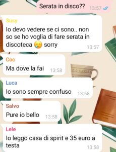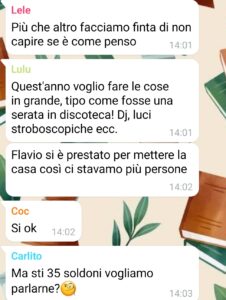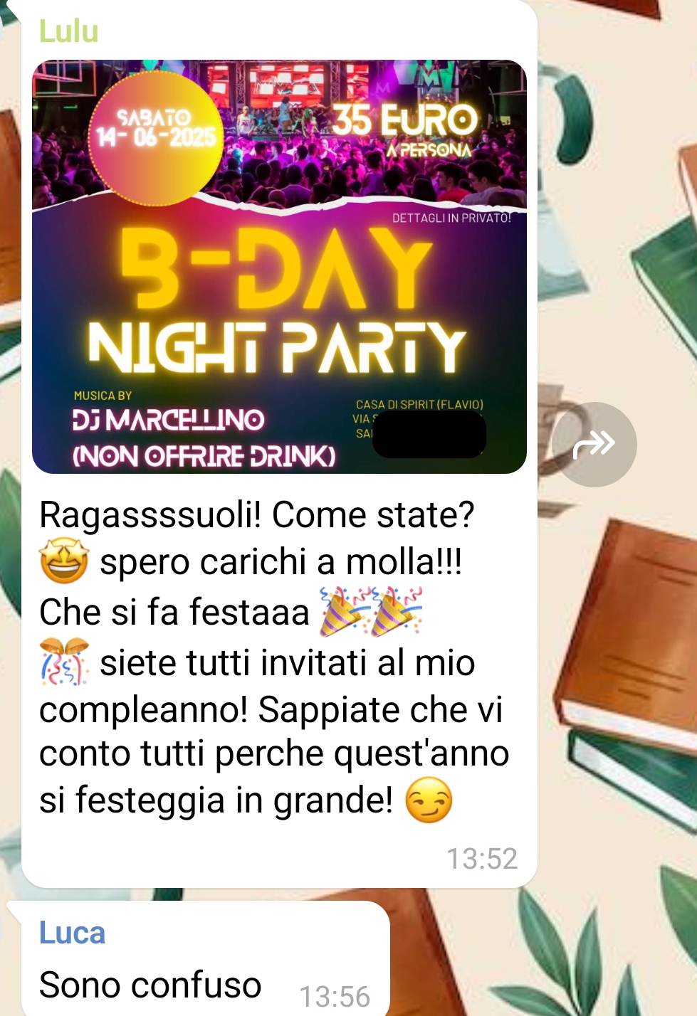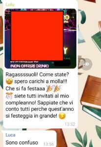 “Buonasera a tutti, mi chiamo Francesca e sono stata invitata al compleanno MOLTO STRANO della mia amica Maria Luisa (Lulu per gli amici). Ora vi provo a spiegare senza annoiarvi troppo, ma dico “molto strano” perché tantissime cose non quadravano”. Lei ha creato un gruppo a parte con tutti gli amici “più stretti” diciamo e ci ha mandato la locandina del compleanno, che immaginatevi nemmeno lo avevamo capito che era per quello! Io pensavo volesse festeggiare in discoteca, fare serata, anche perché ho letto alla veloce mentre facevo commissioni in giro. L’unica cosa che mi è saltata all’occhio sono stati i 35 euro di ingresso a persona. MA… a quanto pare ho capito male! Eravamo tutti un po’ interdetti perché pretendeva delle cose assurde, lei è sempre stata un po’ particolare, ma stavolta si è superata. Siccome sul gruppo non ragionava e insisteva con queste pretese, allora le ho scritto in privato per capire.. e capire ho capito, ragazzi. Ho capito il vero motivo per cui aveva organizzato la festa e tutto il teatrino..”