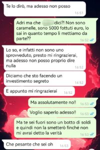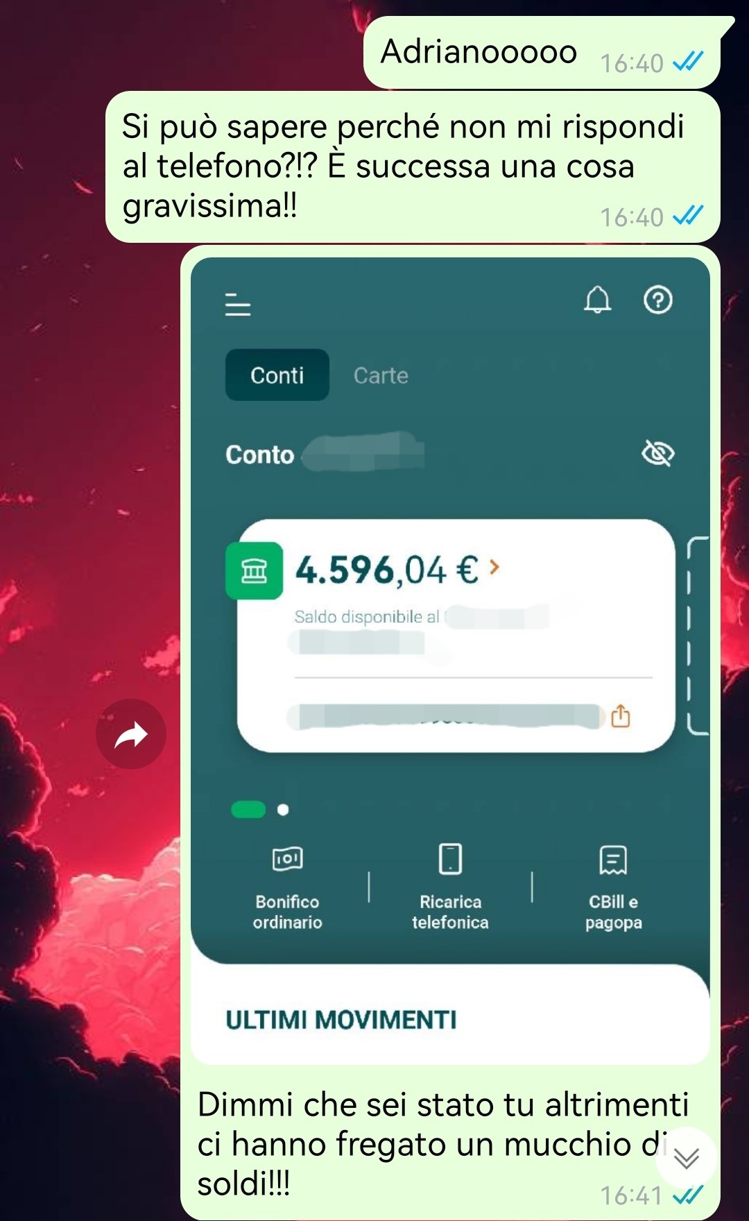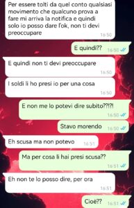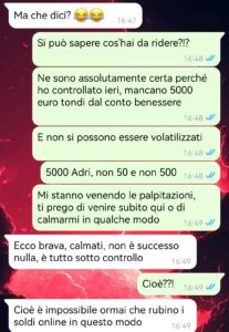“Ho deciso di condividere quanto mi è capitato con il mio ex fidanzato Adriano nella speranza che quanto successo tra noi possa non succedere anche ad altri, anche se temo che episodi come questo, anche se voglio sperare dalla minor portata, capitino molto spesso. Io stavo con lui già da tre anni circa, il nostro rapporto aveva alti e bassi ma ci trovavamo benino. Non siamo quelle coppie da conti correnti in comune perché crediamo nella libertà di entrambi, anche economica, e perché è giusto che ognuno spenda i propri soldi. Nonostante, abbiamo effettivamente un conto in comune (aggiuntivo, dove non vanno gli stipendi e che chiamiamo conto benessere) in cui versiamo ogni mese qualche soldo per uno per viaggi, spese “superflue” e simili. E in tre anni avevamo messo via quasi 10.000 euro solo in quel conto quindi molto bene. Molto bene fino a che l’altro giorno scopro che più della metà erano spariti in un attimo. Ho scritto subito ad Adriano impanicatissima e quello che ho scoperto mi ha fatto passare penso le ore più brutte di tutta la mia vita. E adesso mi trovo in una situazione da cui fatico ad uscire e non so come comportarmi.”