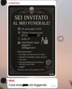 “Ciao ragazzi, mi chiamo Elisa, ho 28 anni e vi scrivo perché quello che è successo a me e ai miei amici merita davvero di finire qui da voi. Abbiamo questo gruppo WhatsApp da sempre e ci sentiamo praticamente ogni giorno, quindi quando vedo che Caterina, una delle mie più care amiche, ha inviato una foto sul gruppo non mi sorprendo. Tutto nella norma. Ecco, questo finché non apro la chat e vedo che la foto in questione in realtà è un invito a un funerale. E non un funerale qualunque, ma il suo. Poi sparisce. Non riceve più i nostri messaggi, segreteria telefonica se la chiami ecc.