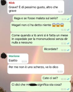 Ovviamente apriti cielo! Ognuno di noi ha reagito diversamente, tipo io nel panico, perché mi è tornato in mente un episodio di un sacco di anni fa in cui, sempre la Cate, mi ha fatto perdere dieci anni di vita. Mi sono presa male perché purtroppo non sono episodi isolati… a Caterina piace stare al centro dell’attenzione e a volte si spinge anche un po’ troppo in là pur di raggiungere questo scopo … però stavolta ha davvero esagerato, secondo me.