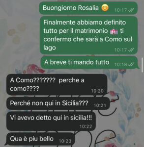 Allora…. Sto per sposarmi, ma purtroppo ho GROSSISSIMI problemi con la famiglia di mio marito che purtroppo è siciliana. Fin da quando hanno saputo della proposta, hanno iniziato a stressarci perché secondo loro dovevamo per forza sposarci giù da loro, perché c’è il mare bello, si mangia bene, perché conosco tutti e ci avrebbero fatto ottimi prezzi per la location eccetera… ma io mi sono imposta in quanto sposa e ho detto NO! A gran voce. Perché sinceramente ho sempre sognato di sposarmi al lago di Como, perché è un luogo davvero magico che mi fa sentire una vip. E poi i miei genitori e tutta la mia famiglia abita qui vicino, quindi è molto comodo per tutti. D’altronde, io sono la sposa. Mio marito ha deciso di accontentarmi ma non sapevo che ci sarebbe stata una vera e propria rivolta da parte di sua madre cioè mia suocera. Una suocera siciliana non la auguro a nessuno.
