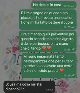 Il problema è esploso nel momento in cui ho condiviso le informazioni relative all’organizzazione…. Nonostante io abbia fatto del mio meglio per aiutarli nell’organizzazione del viaggio e degli spostamenti, no, non le va bene. Ha iniziato a scrivermi cose assurde e anche molto offensive.