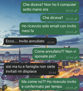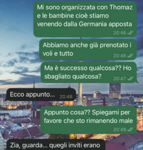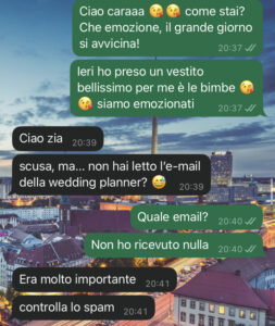 Rispondiamo con entusiasmo, dicendo che saremo presenti: io, mio marito e le bambine. Organizziamo il viaggio, chiedo ferie, prenoto i voli (perché ovviamente si sposerà in Italia), e compro abiti per tutti e 4.