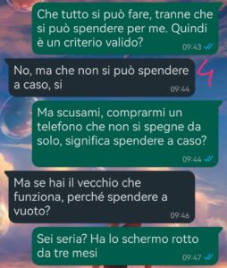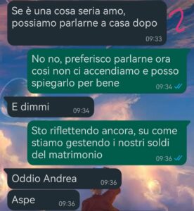 “Non mi sono mai lamentato delle spese. Da quando viviamo insieme ho sempre messo da parte, pensando che le priorità fossero altre: la casa, Sofia, le bollette. Mi andava bene così, perché quando ami qualcuno metti il tuo orgoglio in tasca. Poi ci siamo sposati, il giorno più bello della mia vita, ma, con le buste, pensavo fosse l’occasione per rimettere a posto un po’ di cose per entrambi e invece no. Ho visto solo pacchi per lei e per sua figlia: scarpe, borse, corsi, estetista, cose “necessarie” e indispensabili, “ora che si può fare” meglio approfittare. Io invece continuo a girare con la camicia vecchia e gli occhiali storti, ma va bene, perché “gli uomini possono aspettare”.