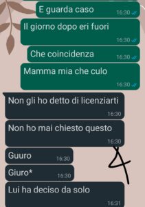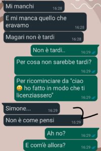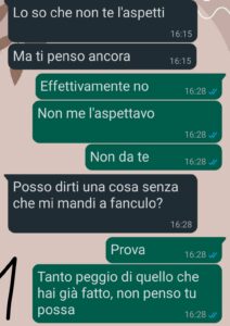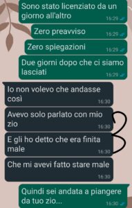 “Io e Giulia siamo stati insieme due anni. Quando è finita, male, lei ha detto che non voleva più vedermi, che non meritavo niente. Nel giro di due settimane, sono stato licenziato. Lavoravo per lo zio di lei. Non mi hanno mai detto il motivo, ma ho saputo che Giulia aveva fatto il giro di telefonate. Oggi, mesi dopo, mi scrive. Dice che ha sbagliato, che mi pensa, che “forse non è tardi”. Io le ho risposto, sì. Ma solo per capire se a lei davvero non sembra di aver fatto nulla. Vi lascio la chat. E vi chiedo: secondo voi, COS’HO FATTO DI MALE?”
