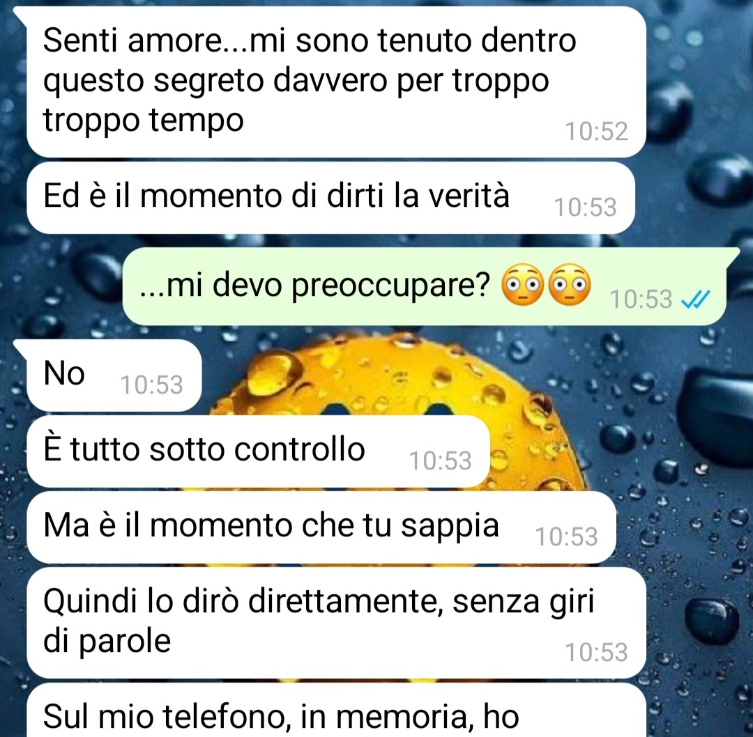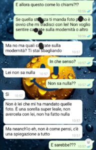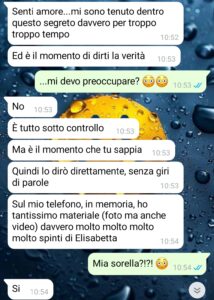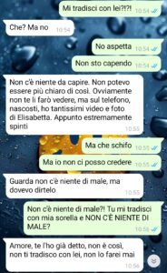 “Ho deciso di diffondere queste chat, più anonimamente possibile, perché, come leggerete da questa chat, non ho alcuna reale persona con cui poterne parlare, e quindi lo sto facendo per sentirmi meno sola. Partiamo dal presupposto che il mio rapporto con Lucio, il mio fidanzato, era ed è ottimo. Lui è un ragazzo d’oro, quando va ammesso, va ammesso. E lo so che il fatto che uno non tradisca o cose simili dovrebbe essere la normalità all’ordine del giorno, ma dato che così non è, il più delle volte, io me ne compiaccio. La nostra storia d’amore, però, è stata dir poco scossa da questo evento che definire inaspettato è riduttivo. Un giorno, dal nulla, mi scrive, mi dice che deve confessarmi un segreto e, senza mezzi termini, mi dice che possiede tanto materiale, diciamo estremamente privato, di mia sorella Elisabetta. Inizialmente, come leggerete, non ci ho visto più. Però c’era fin da subito una grande priorità per me: scoprire tutta la verità e soprattutto prendere dei provvedimenti, perché non ci si comporta così. Personalmente, penso di aver fatto tutto il possibile, ma appunto vorrei sentirmi meno sola condividendo quanto accaduto.”