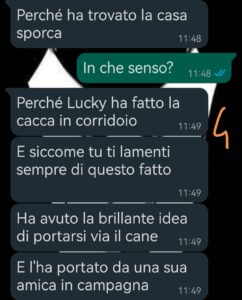 Poi però mi sono ritrovato a fare tutto io: uscite, pulizie, veterinario, persino quando faceva la cacca in casa dovevo correre io perché “lei ha il voltastomaco”. All’inizio ridevo, poi ho iniziato a stancarmi e in tutto questo mia madre ascoltava. Ascoltava troppo. Fino a ieri, quando ha preso una decisione enorme senza dirmi nulla.