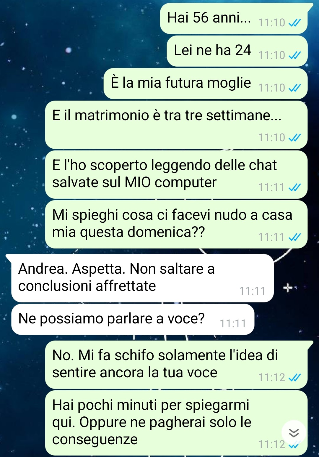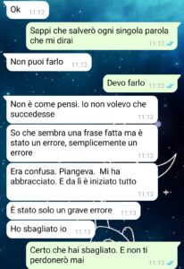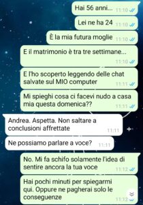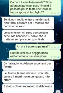 “Non ho mai avuto un rapporto facile con mio padre. Non era violento o altre cose così, ma la sua presenza in casa era come un giudizio costante. Ogni cosa che facevo sembrava non essere mai abbastanza per lui. Aveva quell’atteggiamento freddo, da uomo che crede di sapere tutto, che pensa di essere sempre un passo avanti. Forse è anche per questo che quando ho conosciuto la mia attuale fidanzata mi ci sono aggrappato con tutto me stesso. Con lei ero libero. Amato. Visto. Finalmente visto. Era un pochino più giovane di me, ma aveva quella luce negli occhi che ti fa credere in qualcosa di bello. Le ho chiesto di sposarmi dopo due anni che stavamo insieme. Mi sembrava giusto. Mi sembrava perfetto. E mi detto sì. Ero felice. Poi è successo. Per caso, ho letto delle chat che erano state salvate sul mio computer, che usa anche lei. All’inizio ho pensato fosse uno scherzo malato. Poi ho trovato altre prove. Non sto a raccontarvi tutto qui, tanto c’è la chat. Vi basti sapere che mio padre, proprio lui, ha deciso che rovinare solo l’infanzia di suo figlio non bastava.”