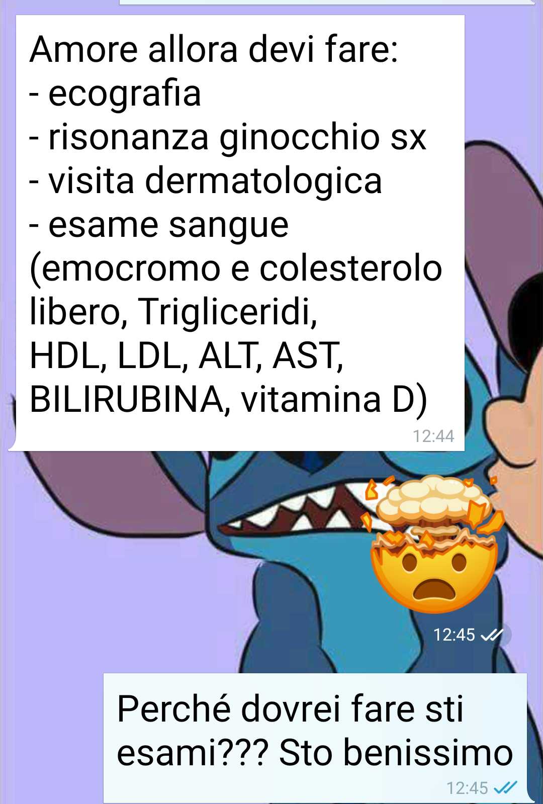 La mia fidanzata si preoccupa troppo non solo della sua salute ma anche della mia. Mi vuole far fare diversi esami per la salute, in sostanza vuole che mi analizzi dalla testa ai piedi. Io non posso dirle che mi fa male la testa che già parte col suggerimento tac. Il problema è che da brava ipocondriaca si informa, eh. Le sue non sono lamentele campate in aria. Si informa, studia. Questo le permette di ammantare le sue imposizioni folli di un velo di verosimiglianza che ti fa venire il dubbio di avere davvero pure il vaiolo, anche se il vaiolo è stato debellato da decenni.