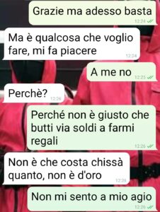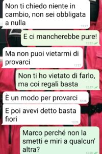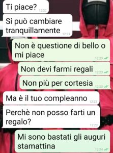 Ciao pagina di spunte, questa è la chat che è venuta fuori con Marco, il giorno del mio compleanno. Mi sono vista recapitare un regalo da parte sua. Dopo mesi di fiori, cocktail offerti e pensierini vari ho deciso di prendere di petto la situazione. Ho dovuto essere brutale e anche un po’ stronza, ma in fondo ho solo detto la verità. Quella verità che tutti conoscono ma che pare brutto dire. Vorrei capire dal vostro punto di vista se ho sbagliato. Ad ogni aperitivo gli ho sempre detto che non doveva offrire nulla. E sono stata chiara subito che non ero interessata alle sue attenzioni. Ok, avevo apprezzato quando la prima volta si era presentato alla vecchia maniera, con coraggio e spavalderia, in mezzo ad un tavolo di ragazze. Ma sono sempre stata chiara, già dai contatti social, che al massimo si poteva arrivare ad una bella amicizia. E invece mesi di “incontri casuali” e regalini.”
