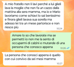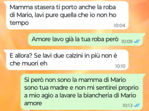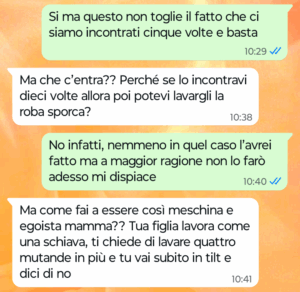“Buongiorno Spunte Blu, mi chiamo Emanuela e ho una figlia molto ribelle e testarda, contrariamente al maschio che invece non mi ha mai dato nessun problema. Mia figlia si chiama Katia, vive in un appartamento tutto suo ma da sei mesi ha iniziato a convivere con un tizio che io personalmente ho visto solo cinque volte in vita mia. Io sono sempre stata buona e disponibile in tutto e per tutto con mia figlia ma adesso temo che lei se ne stia approfittando troppo. Stamattina Katia mi scrive con una richiesta veramente assurda e vi basterà leggere la mia chat per essere d’accordo con me spero. Mi si può dire tutto insomma ma non che sono una cattiva madre e questa è una cosa che non devo dimostrare a nessuno perché so quello che dico e so quello che ho fatto per mia figlia in tutti questi anni…”