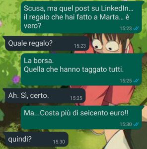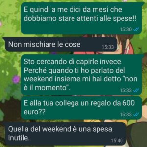 Con me, intanto, il discorso era sempre lo stesso: dobbiamo risparmiare, non è il momento, meglio evitare spese inutili. Io mi adeguavo. Mi dicevo che era maturità, che una relazione sana non ha bisogno di regali costosi. Poi ho visto quella foto. Il regalo. Il prezzo. E soprattutto il contesto: fatto con naturalezza, senza esitazioni, senza “non è il momento”.
