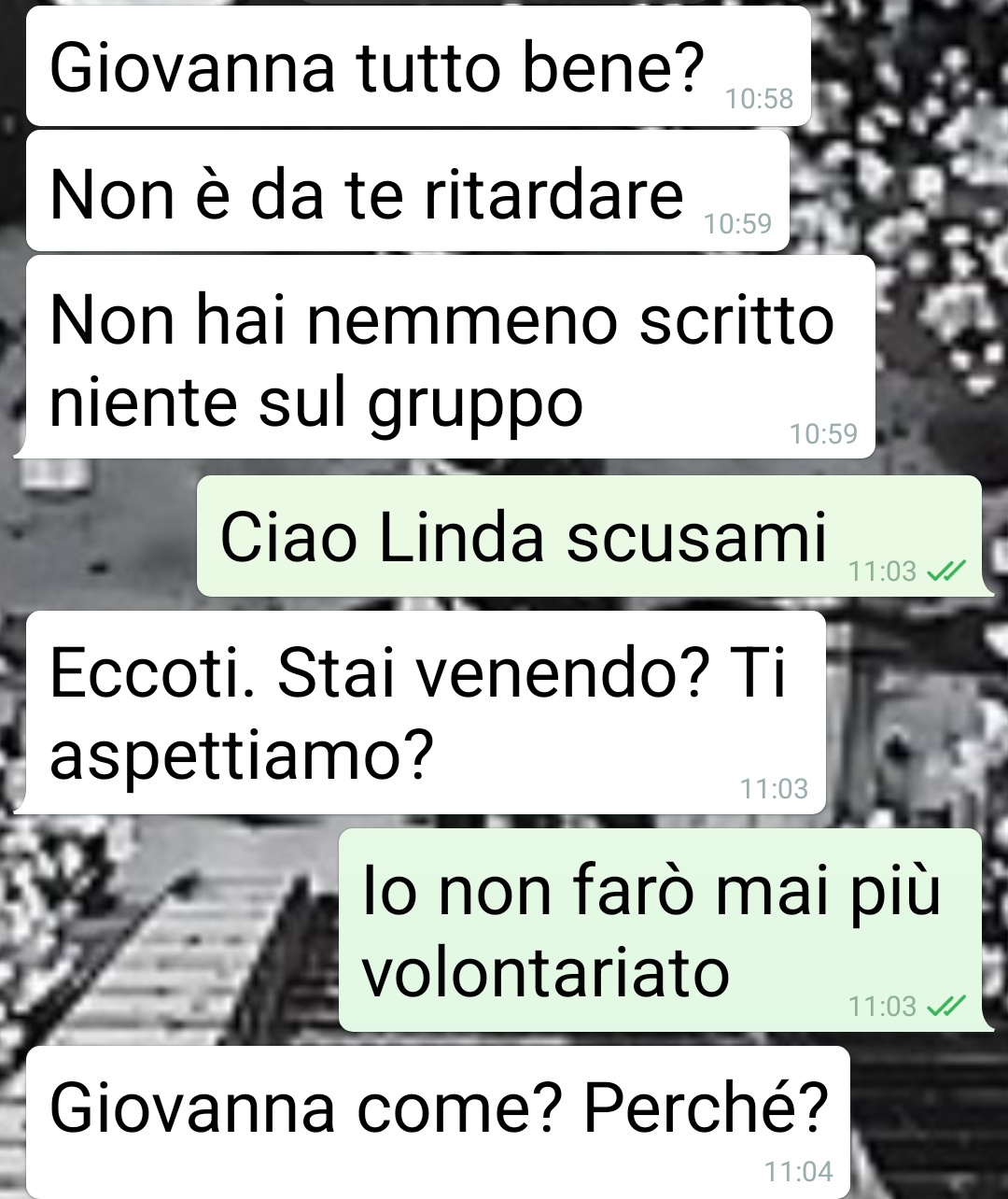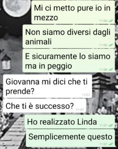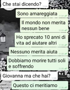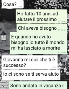“Io sono Giovanna e ce l’ho con il mondo intero. Non può essere diversamente dopo quello che mi è accaduto. Siamo una razza meritevole dell’estinzione. Per la prima volta mi sono trovata in difficoltà tato da chiedere aiuto a degli estranei. A tanti estranei. Se qualcuno mi avesse raccontato quello che leggerete in questa chat non ci avrei mai creduto. MAI. Ma l’ho vissuto sulla mia pelle. Ed ormai è assodato. Le persone fanno tutte schifo, non meritano niente. Si, tutte. Io e anche voi che leggete. Non vi mando sta chat con Linda per chissà che cosa. Neanche per farvi vedere quanto a lei importi della cosa, cioè niente. A lei interessa che perde una adepta. Voglio solo vedere quanti bugiardi spuntano che mi avrebbero aiutato eccetera eccetera. E quanti almeno onesti dicono le cose come stanno, ovvero che se ne sarebbero lavati le mani. Fanculo tutti”