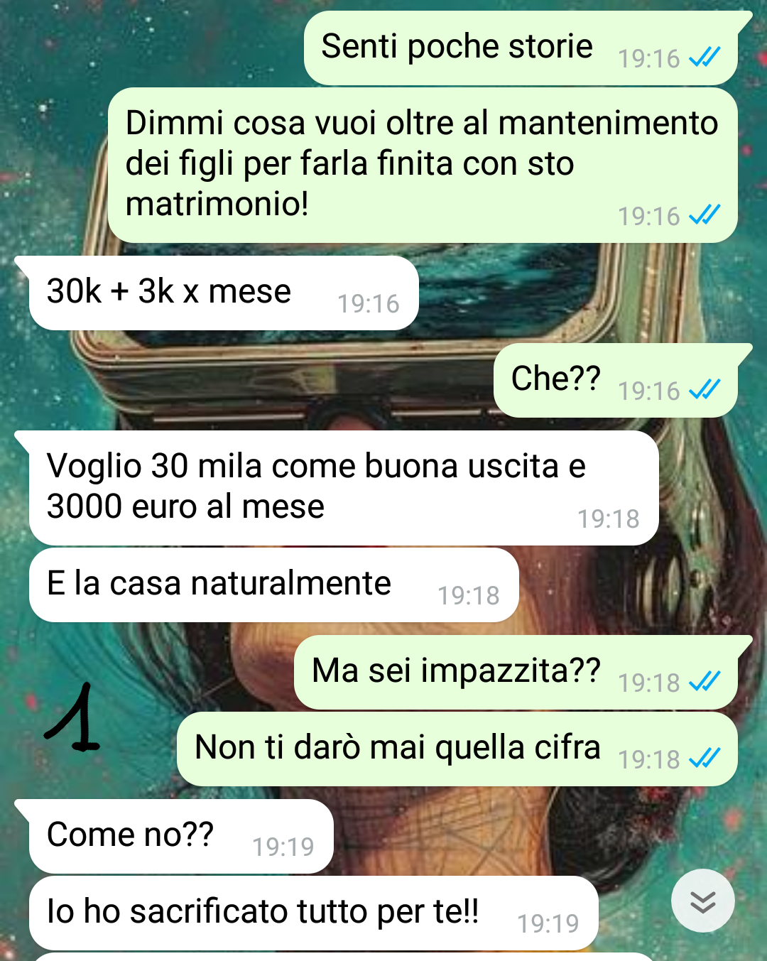 Bene oggi siamo alla resa dei conti: dopo mesi di tira molla ho deciso di chiederle che cosa voleva (ossia quanti soldi!!) per divorziare. Sapevo fosse avida ma non credevo fino a questo punto…”