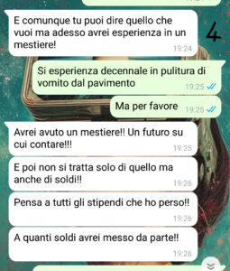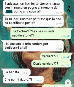Lei non faceva davvero la casalinga comunque: avevamo una colf e una baby sitter, tutte le comodità.. lei alla fine passava il tempo più che a occuparsi dei bambini o della casa a spendere i miei soldi in vestiti e uscire con le amiche! Ha fatto la bella vita alle mie spalle, questa è la verità!!