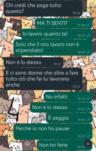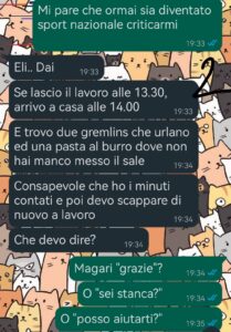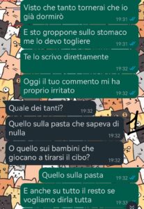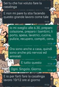 “Quando ho lasciato il lavoro per dedicarmi alla casa e ai bambini, non l’ho fatto per diventare la donna delle pulizie o la cuoca a tempo pieno. L’ho fatto perché credevo che fosse giusto per noi, per crescere i nostri figli in un ambiente sereno. Ma negli ultimi mesi, ogni giorno è diventato un giudizio. Ogni pasto è “sciapo”, ogni gesto è “scontato”, ogni stanchezza viene etichettata come esagerazione. Gianluca lavora, sì. Ma io non smetto mai. Non timbro il cartellino quando i bambini dormono. E quello che fa più male non è la fatica, è l’indifferenza. La sensazione di non valere niente solo perché non porto a casa uno stipendio. Questa chat è nata per dire basta. Per farmi sentire. Non so se servirà a cambiare qualcosa. Ma almeno ora sa come mi sento. E forse, anche lui si sentirà un po’ più piccolo dentro quel “grande uomo di casa” che crede di essere.”