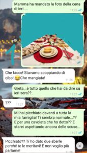 L’episodio protagonista della chat che vi mando risale a una cena di Santo Stefano dove eravamo a casa della mia famiglia con mia mamma mio padre, mio fratello, mio cugino e i miei zii.