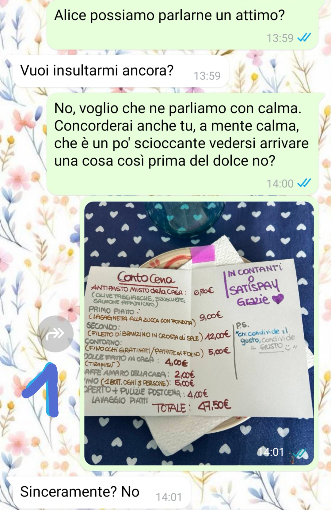Vi lascio leggere la chat intera e le assurde motivazioni di Alice a questo gesto.
