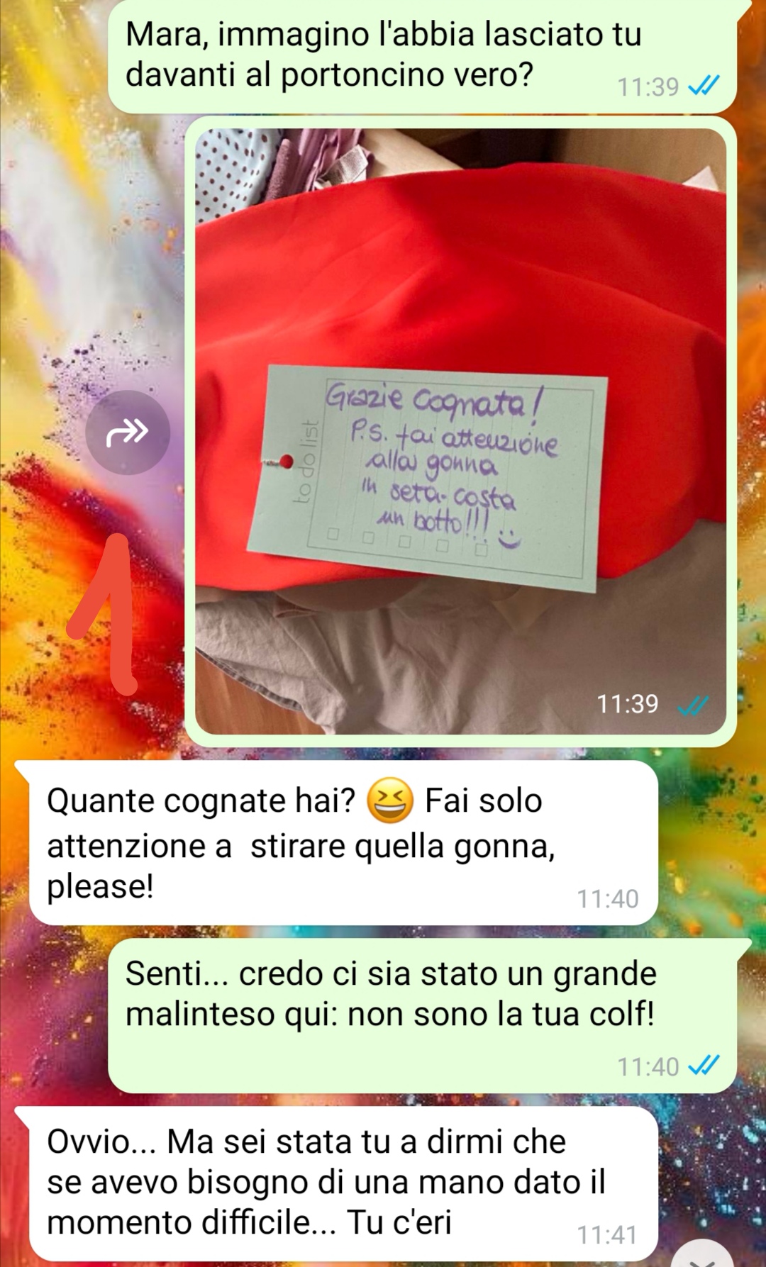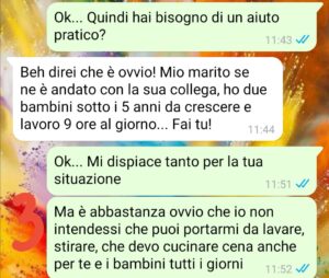 Marito che da un mese circa se ne è andato con la donna con cui aveva una relazione, lasciandola sola. È stato un po’ un fulmine a ciel sereno per tutti, in realtà e sia io che mio marito siamo dispiaciuti per mia cognata. Abitando attaccate, sono andata da lei e le ho detto che per qualsiasi cosa io c’ero. Ma mi sono subito pentita di questa disponibilità…perché purtroppo da quel momento lei ha frainteso le mie parole e guardate come ha cominciato a comportarsi…