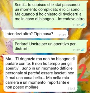 L’altro giorno poi arriviamo al culmine quando mi trovo davanti al portoncino di casa ciò che vedrete in apertura di chat… capisco che è arrivato il momento di parlarle e così faccio…