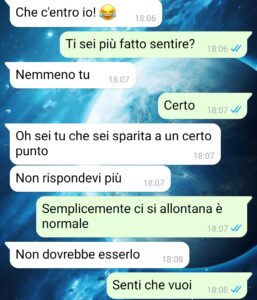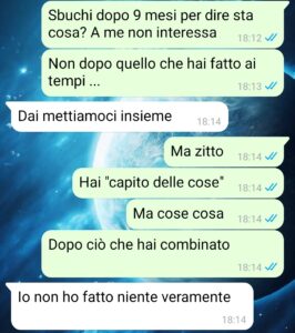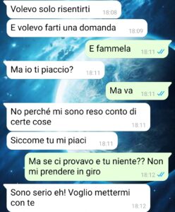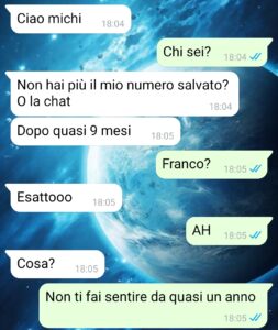 “Ciao, il mio nome è Michela e ora vi racconto tutto quello che è successo con Franco. Io e Franco ci siamo conosciuti un annetto fa, la cosa sembrava andare bene, ci sentivamo sempre in chat e ci si vedeva con amici e io ogni volta ci provavo con lui, gli lanciavo segnali, ammiccamenti, frasi e proposte più o meno velate. Il problema è che lui non è mai stato reattivo alle mie proposte di fare qualcosa, di stare insieme, di passare alla fase successiva, a quella dove non si parla soltanto, ma si agisce. Perciò, arrivati a un certo punto, mi sono decisa a desistere, lasciare perdere totalmente quello che volevo, quelli che erano i miei propositi per una coppia che poteva funzionare e ho semplicemente smesso di sentirlo, di parlarci e ci siamo allontanati. Saranno passati un 9 mesi da quando abbiamo smesso di sentirci totalmente, e ora mi ritrovo un suo messaggio e lui che mi dice delle cose che non credevo mi sarei mai sentita dire in tutta la mia vita, eppure eccoci qui ad affrontare la cosa nove mesi dopo.”
