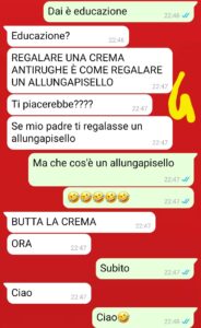 “Ciao Spunteblu, in questo strano Febbraio che sa un po’ di Aprile vi mando questa breve conversazione con la mia ragazza per regalarvi uno spaccato della mia relazione, che come un funambolo rischia da un momento all’altro di sfracellarsi ogni volta che mia madre e la mia ragazza, in qualsiasi modo, entrano in contatto. Donne, io vi amo, ma perché vi fate sempre la guerra? Mia madre e la mia ragazza sono due toste, senza peli sulla lingua, e infatti all’inizio sembrava avessero molto in comune. Ero felice! Pensavo addirittura che si volessero molto bene. Invece mi sbagliavo perchè sono come cane e gatto. E io sto sempre in mezzo a cercare di placare gli animi (un giorno mi stancherò). Questa volta il problema è nato da un gesto che io ho reputato (erroneamente, a quanto pare) genuino: un regalo. Ero stato a cena da mia madre e poco prima che me ne andassi lei mi ha dato una crema antirughe da dare alla mia ragazza…