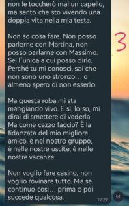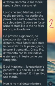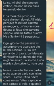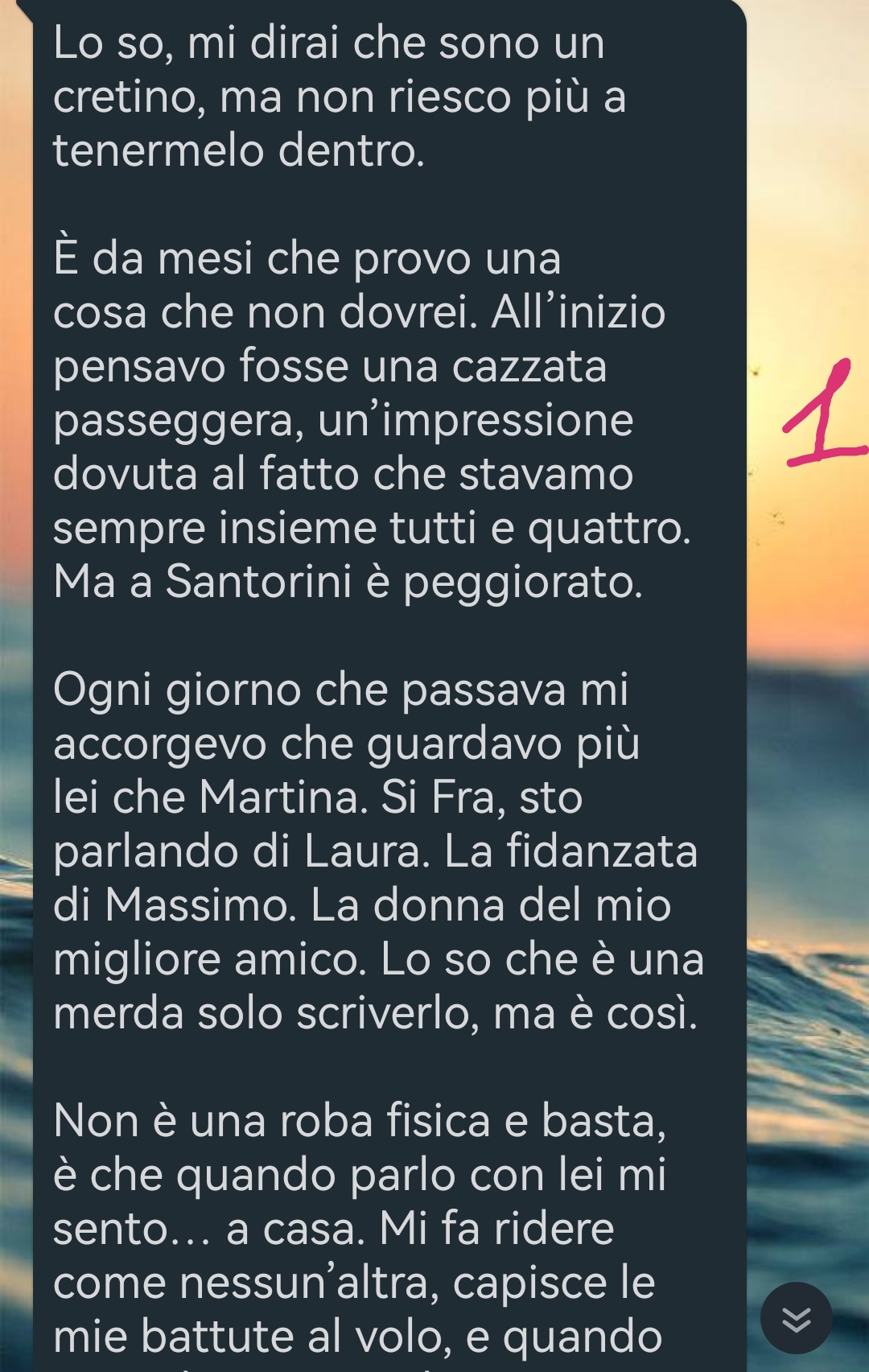 “Siamo un gruppo di 4 persone, affiatatissimo. Io, il mio fidanzato Massimo, Paolo nonchè migliore amico di Massimo, e Martina, la fidanzata di Paolo. Eravamo tornati da pochi giorni da una vacanza a Santorini quando mi vibra il telefono. Era Paolo. Apro… e trovo un papiro infinito. All’inizio non capisco, poi mi si gela il sangue: è una dichiarazione d’amore. Per me. Paolo mi racconta di come a Santorini si sia reso conto di provare qualcosa, di come ogni momento passato insieme lo abbia segnato, di come si senta in colpa perché io sono la fidanzata del suo migliore amico e lui è impegnato con Martina. Quel messaggio non era per me, ma per Francesca, un’amica sua che conosco di vista. Solo che a me è arrivato tutto.. E io, ancora adesso, non so se ho più paura per quello che ha scritto… o per quello che comporterà tra di noi quattro.”