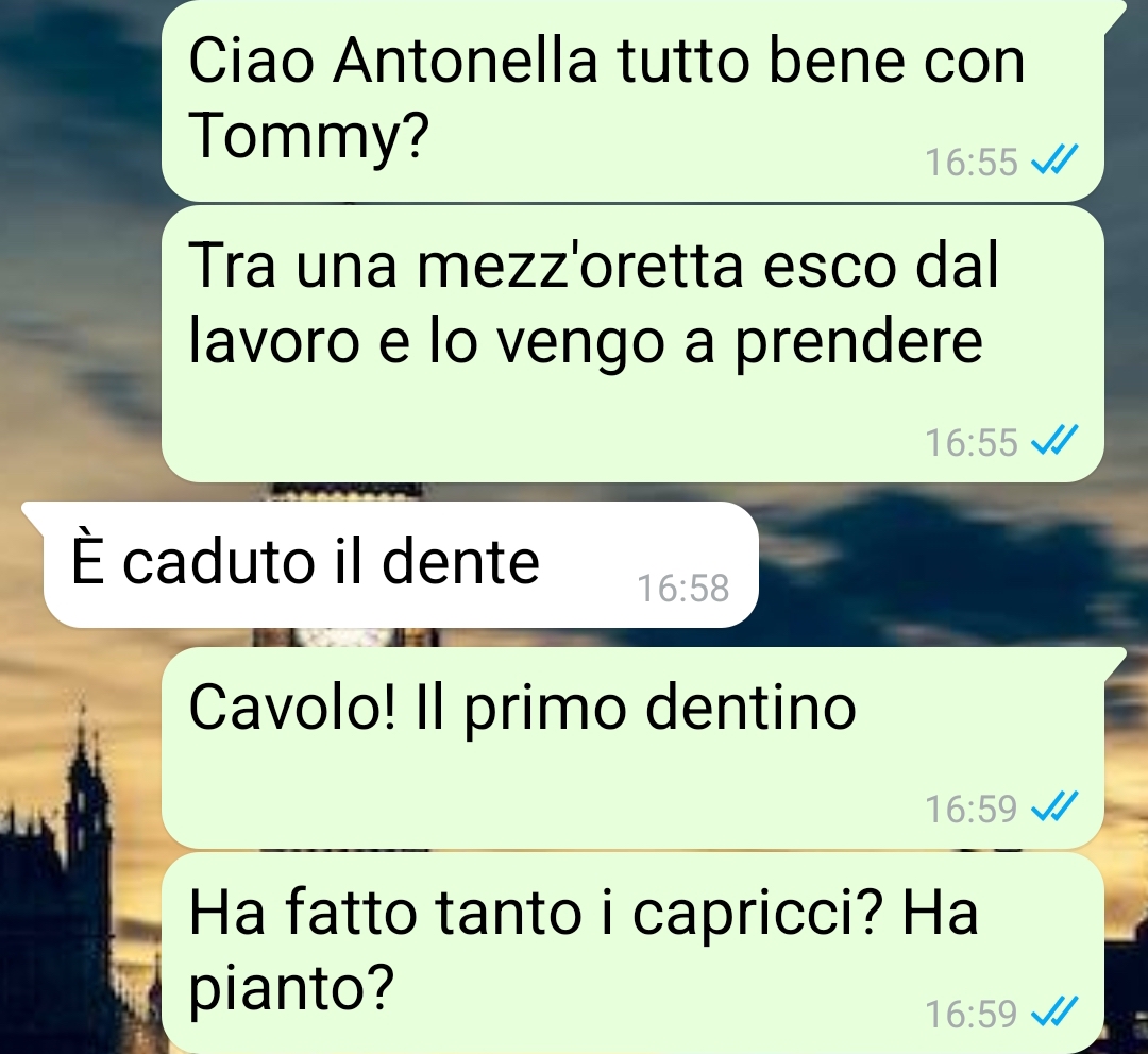 “Come si spiegano certe cose a tuo figlio di sei anni? Come si spiega a tuo figlio di sei anni neanche compiuti che ora la famiglia è composta solo da lui, da me il suo papà e dai nonni? Non si riesce.. Io non riesco, magari per alcuni sarebbe più facile, ma per me no. Porto mio figlio dalla nonna materna Antonella, santa suocera e santa nonna, prima di andare al lavoro e poi me lo vado a riprendere quando esco dall’ufficio. Siamo solo io e lui. E Antonella. Bisogna cavarsela. Anche se è dura. A settembre inizierà le elementari e mi preparo già da ora alle mille domande che i compagnetti di scuola gli faranno e che lui riporterà a me e io rimarrò spiazzato. Ma Antonella dice che i bambini interpretano, a modo loro, i fatti e ciò che noi diciamo loro. E sono sereni, felici, perché hanno le loro convinzioni di bambini e nessuno gliele può togliere. Nel frattempo voglio condividere questo primo evento con voi: Tommaso ha perso il suo primo dente da latte e, come dice Antonella, ha interpretato tutto a modo suo..”