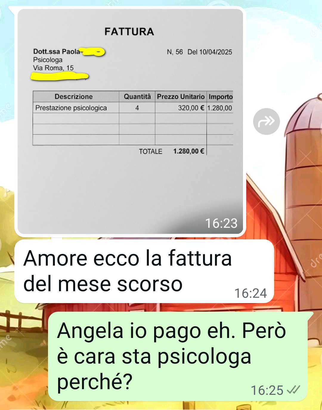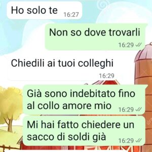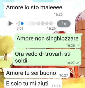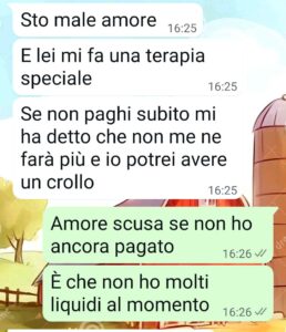 Purtroppo però il male ci deve mettere sempre lo zampino e noi non possiamo essere felici per colpa di questo problema di salute. E io sto facendo i debiti, sto lavorando come un mulo, ho pure una madre sofferente ma non so come fare per pagare le sue cure che sono sempre più care. Ogni mese i 1200 per la psicologa e io non ce la faccio più. Ora mi ha chiesto di fare una cosa che io le ho detto sì ma mi dispero perché non so come potrei vivere senza…”