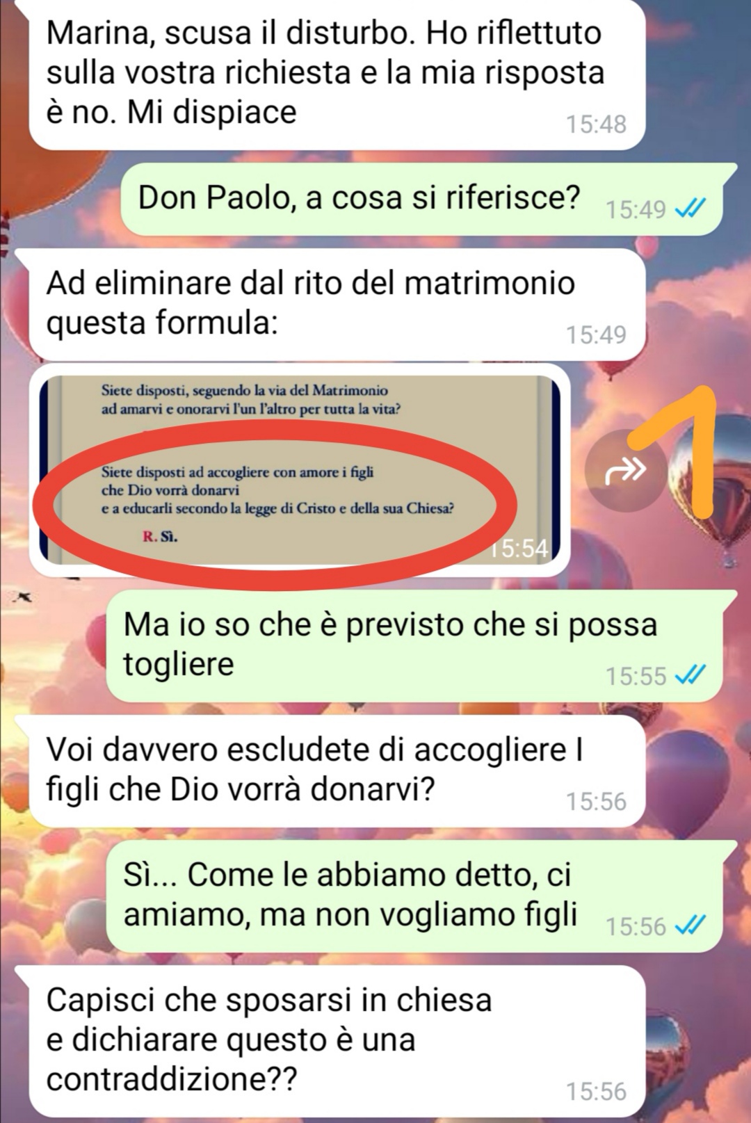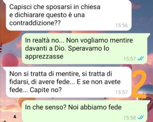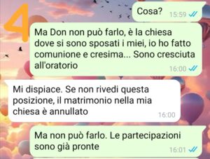 Vi sembra giusto? Qualcuno di voi ha esperienze simili che vorrebbe condividere così da riportarle al parroco? Perché io credo che ciò che vuole fare lui sia un’ingiustizia! Io so che abbiamo chiesto una cosa lecita, fattibile e abbiamo diritto di pensarla così…ma questa conversazione mi ha messo molto in crisi!”