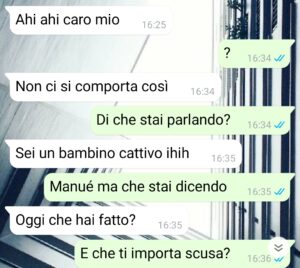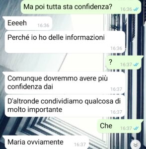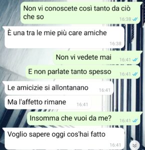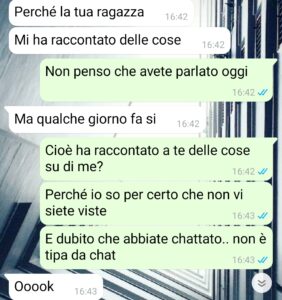 “Premetto che, anche se ciò che ho fatto all’oscuro della mia ragazza è sbagliato, posso dire a tutti voi che per fortuna la mia relazione non ne ha intaccato, anche se il rischio c’è effettivamente stato. Per fortuna la persona con cui ho parlato in questa chat ha fatto sì che l’attenzione della mia ragazza venisse veicolata, così la sua rabbia. Questo non mi giustifica e non mi rende innocente, ma dovete anche capire che se uno come me ha una tentazione ha difficoltà a trattenersi. Comunque non vi anticipo niente, ma vi dico soltanto che io e la mia ragazza molti giorni fa abbiamo discusso e lei mi ha detto che se avessi rifatto il fattaccio, che poi ho effettivamente fatto ricadendoci, non avrebbe più voluto stare con me. Poi lei, a quanto pare, si è confidata con una persona e questa persona non ha mantenuto il segreto, ma l’ha detto a mezzo mondo. Questa storia spero vi faccia capire che dovete stare attenti a chi vi fidate, perché i vostri segreti potrebbero non essere tali. In ogni caso una delle persone che hanno saputo di me, mi ha contattato e ha fatto una richiesta assurda.”