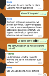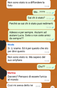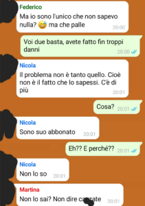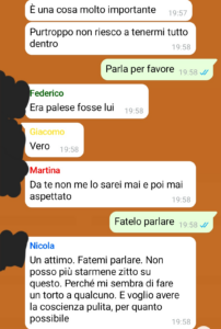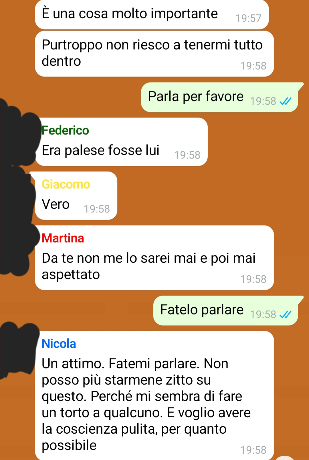 “Ero davvero sconvolto dalla situazione. Veramente. Non tanto per quello che avevo scoperto, che di certo non mi faceva piacere, ma più che altro perché, da un lato, non riuscivo a cavare un ragno dal buco e a trovare il colpevole, e dall’altro perché quasi io ero stato accusato di aver fatto qualcosa di male. Non avrei dovuto condividere la sua foto? Teoricamente non l’ho fatto, ho solo messo a disposizione di tutti le prove per far saltare fuori questo benedetto colpevole che continuava a nascondersi. Ma il problema non è questo, il problema è quello che è successo di lì a poco. Qualcosa di veramente inaspettato che mai e poi mai avrei potuto prevedere. Questa storia, senza fare spoiler, non è finita bene, per niente. Ma nonostante ciò sono qui, qui davanti a tutti ad espormi perché ribadisco il mio messaggio. Quello che è successo è davvero grave, e se un fidanzato o una fidanzata vede il partner in quelle condizioni, a prescindere dal suo volere, deve intervenire. Perché l’amore è anche prendere decisioni scomode per il bene della coppia. Io non mi pento di nulla.”
