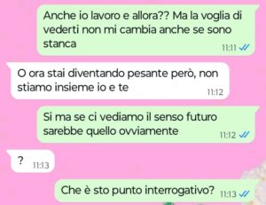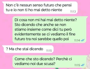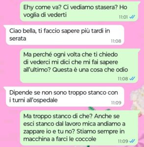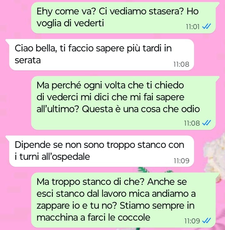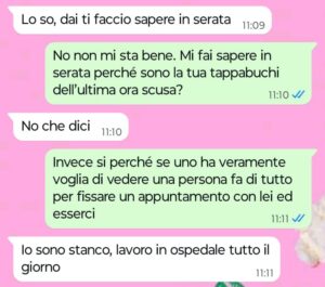 “Ciao Spunte Blu mi presento sono Naomi ho 32 anni e lavoro come commessa. Un mese e mezzo fa ho conosciuto un ragazzo bellissimo che fa il medico si è laureato da poco e sta facendo la specializzazione con turni massacranti a quanto pare in ospedale, in poche parole è sempre buttato lì dentro. Di solito comunque appena siamo entrambi liberi ci vediamo solo che lui ha una brutta abitudine che odio ogni volta che gli propongo di vederci. Non a caso stamattina infatti gli ho proposto di vederci stasera e come al solito lui mi ha risposto in quel modo odioso… ma magari fosse solo questo quello che mi ha detto… vi lascio alla lettura della mia chat e capirete tutto l’inferno che è successo dopo tra noi. Questo tizio è solo un’anima squallida che meriterebbe di restare solo a vita, veramente una brutta persona che ha giocato e mi ha usata per un mese e mezzo e sfido chi mi dice il contrario.”