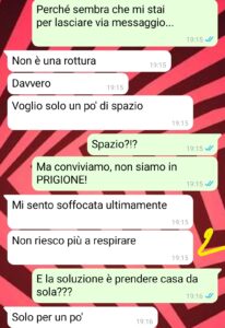 Lì è stato come un fulmine a ciel sereno e ho capito, o meglio realizzato, che qualcosa si era rotto. Ma una volta che ho cercato di capire del perchè lei mi giurava di no. Dice che non è una rottura, che mi ama ancora, ma ha bisogno di spazio, di respirare, di “ritrovarsi”.