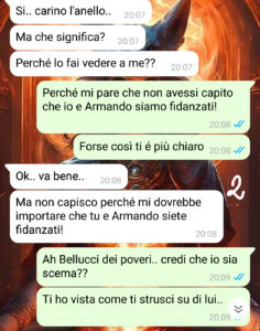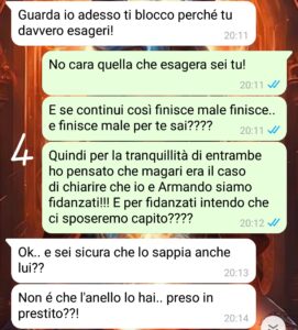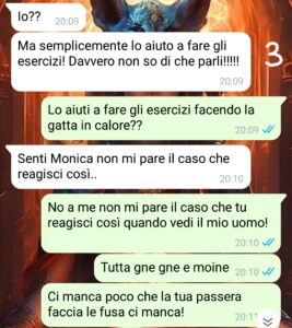 “Ciao SpunteBlu, mi chiamo Monica e sto con Armando.. anzi non ci sto semplicemente insieme: noi siamo fidanzati e a breve ci sposeremo! Sono davvero felice ma anche un po’ preoccupata perché il mio Armando è davvero un bell’uomo e purtroppo le donne lo notano e non poco.. e si, io mi fido di lui eh ma come si dice.. fidarsi è bene ma stare in guardia è anche meglio!! Tra le tante quella che mi preoccupa di più è Federica, una ragazza che lavora nella palestra che frequentiamo entrambi: recentemente Federica fa un po’ troppo la simpatica con il mio uomo.. sempre carina, sempre sorridente, sempre a strusciarsi.. insomma fa le fusa come una gatta in calore intorno ad Armando e io davvero non ci vedo più dalla gelosia! Anche perché cavolo, certo, lui è bravo e io mi fido però lei davvero esagera.. All’inizio mi sono limitata a farle capire che non era il caso poi, dato che non recepiva, sono passata alle vie di fatto e ho deciso di scriverle. Meglio essere chiari.. all’inizio lei ha anche fatto finta di non capire..”