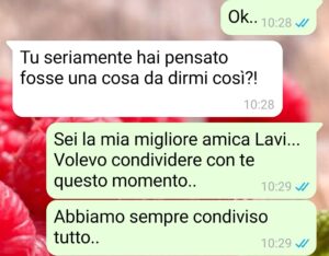 Non so nemmeno da dove cominciare, quindi parto dalla cosa più semplice: una chat. Io e Lavinia ci conosciamo da una vita, di quelle amicizie che non devono spiegarsi troppo perché “ci sei” e basta. Solo che negli ultimi mesi è successo di tutto: lei ha perso un bambino con un aborto spontaneo e io le sono stata vicina come potevo, anche quando non sapevo cosa dire e mi sembrava di dire sempre la cosa sbagliata. Nel frattempo però mi è capitata una cosa enorme, di quelle che ti cambiano la vita e il modo in cui guardi il futuro.